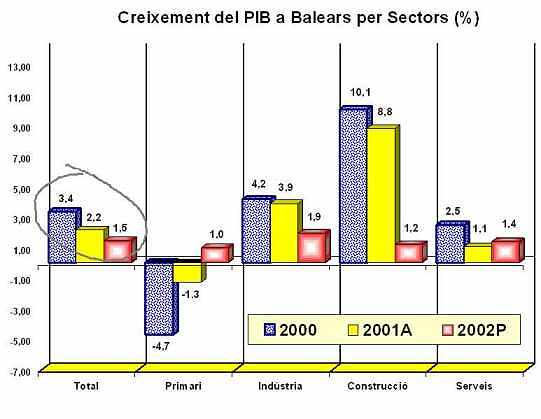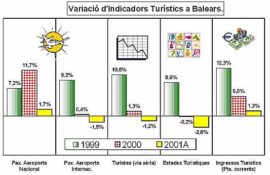 Per illes, Menorca mostra un major dinamisme, amb un ritme dexpansió del 3,2%. El millor comportament relatiu del turisme a Menorca origina aquest major augment del PIB. Per altra banda, els resultats més modestos de la temporada turística a Mallorca, i especialment a les Pitiüses, han reduït el seu creixement de manera significativa El turisme redueix el seu ritme dactivitat, principalment a les Pitiüses i a Mallorca. Al conjunt de lany 2001 el número destades turístiques es reduïren a lentorn del 2,8% respecte a 2000, conseqüència de la caiguda en el número de turistes arribats per via aèria (-1,2%) i de la reducció en lestada mitjana. Les entrades i sortides totals de passatgers als aeroports de Balears baixen un 0,7% (-1,5% el tràfic internacional i +1,7% el nacional). Els ingressos per turisme augmenten al entorn del 1,3%, en pessetes corrents, per lefecte de la pujada dels preus. En conjunt suposaren prop de 5.858 milions deuros (974.688 milions de Pts.)
