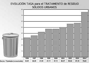 En el informe económico-financiero del expediente se detalla minuciosamente el origen de esta tasa, ya que la Ley 39/1998, Reguladora de las Haciendas Locales, así lo exige, y se imputa su encarecimiento, sobre todo, a las inversiones que se realizarán en 2004 en nuevos proyectos como una planta de compostaje o la puesta en marcha de infraestructuras para la Gestión de Residuos de Construcción, Demolición, Voluminosos y Neumáticos fuera de uso de Mallorca, lo cual supondrá un aumento en el número de toneladas tratadas. Si observamos el gráfico podemos ver como esta tasa se ha más que duplicado en el periodo comprendido entre 1996 y 2004.
